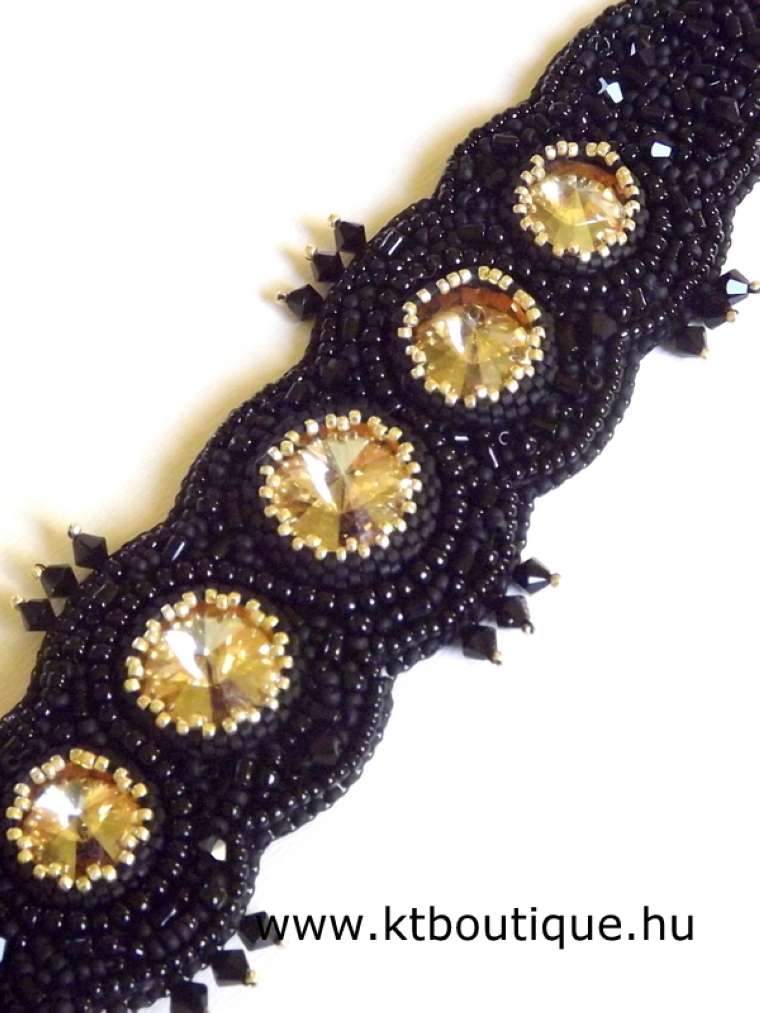Mikor a kövek már mind a helyükre kerültek, meghímeztem a fő motívumot, a belső hullámvonalat nagyobb kásagyönggyel és a külső szélét kisebbel. Majd elkezdtem kitölteni a fennmaradó helyet mindenféle formájú fekete gyönggyel. Tettem bele fényes és matt kását különböző méretben, szalmagyöngyöt és Swarovski gyöngyöket.